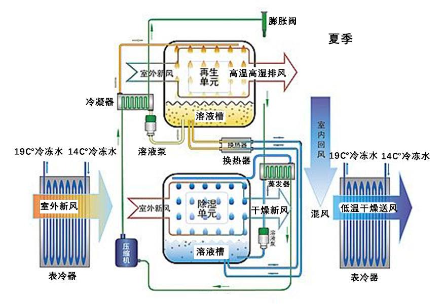溶液除濕空調(diào)系統(tǒng)利用溶液直接處理空氣 ,在室內(nèi)風(fēng)機(jī)盤管中沒有冷凝水 ,因而避免了傳統(tǒng)空調(diào)系統(tǒng)中風(fēng)機(jī)盤管的凝水盤滋生細(xì)菌的問題。另外 , 常用的除濕鹽溶液 ,如氯化鋰、溴化鋰、氯化鈣等均具有殺滅細(xì)菌微生物等作用。已有測試表明 , 常溫下 3 mL 溴化鋰溶液能夠在 3 h 內(nèi)殺死 5 萬個XL 12blue 實(shí)驗(yàn)細(xì)菌。氯化鋰溶液能殺死葡萄球菌、鏈球菌、肺炎桿菌、大腸桿菌、變形菌、綠膿桿菌、壞疽菌等 。實(shí)際系統(tǒng)中 ,病菌在鹽溶液停留的時間較長 ,為溶液的殺菌提供了條件。