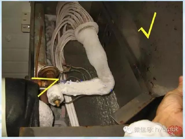 另外當系統中出現膨脹閥供液時多時少或膨脹閥關不小,過熱度,過冷度不正確等現象時,原因可能就是感溫包出了故障。感溫包故障包括毛細管斷裂,使感溫包內的充注物漏掉,導致不能把正確的信號傳給熱力膨脹閥的執機構,以及感溫包包扎位置不正確。