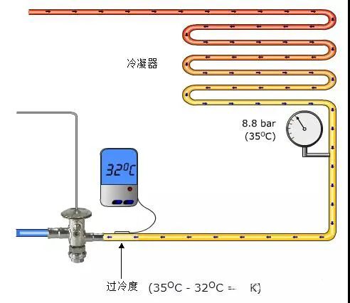 過冷度的定義:冷凝器冷凝壓力對(duì)應(yīng)的飽和液體溫度和冷凝器出口液體實(shí)際溫度的差值。