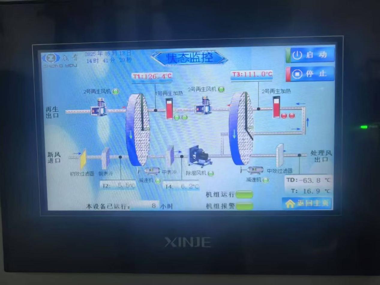 針對嵐圖的技術需求,眾有研發(fā)團隊創(chuàng)新采用三級除濕工藝:首級預冷除濕將空氣含濕量降低60%,二級轉輪吸附實現(xiàn)-45℃露點深度脫水,三級冷凝強化確保最終露點穩(wěn)定在-64.2℃。其中,核心部件蜂窩硅膠轉輪采用納米級疏水涂層技術,吸附效率較傳統(tǒng)材料提升40%;再生系統(tǒng)搭載智能變頻加熱模塊,能耗較行業(yè)平均水平降低25%。該設備在20℃/60%RH工況下,除濕量達400L/h,溫濕度波動范圍±0.3℃/±3%RH,綜合性能指標優(yōu)異。
