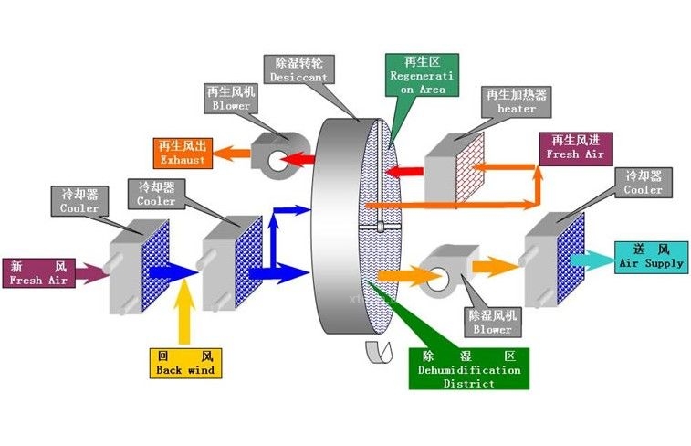 轉(zhuǎn)輪除濕機(jī)的核心結(jié)構(gòu)是一個不斷轉(zhuǎn)動的轉(zhuǎn)輪,是由特殊復(fù)合耐熱材料制成的波紋狀,載有吸濕劑的蜂窩狀轉(zhuǎn)輪,蜂窩狀轉(zhuǎn)輪具有吸濕比表面積大、流通阻力小、除濕效率高等特點(diǎn)。