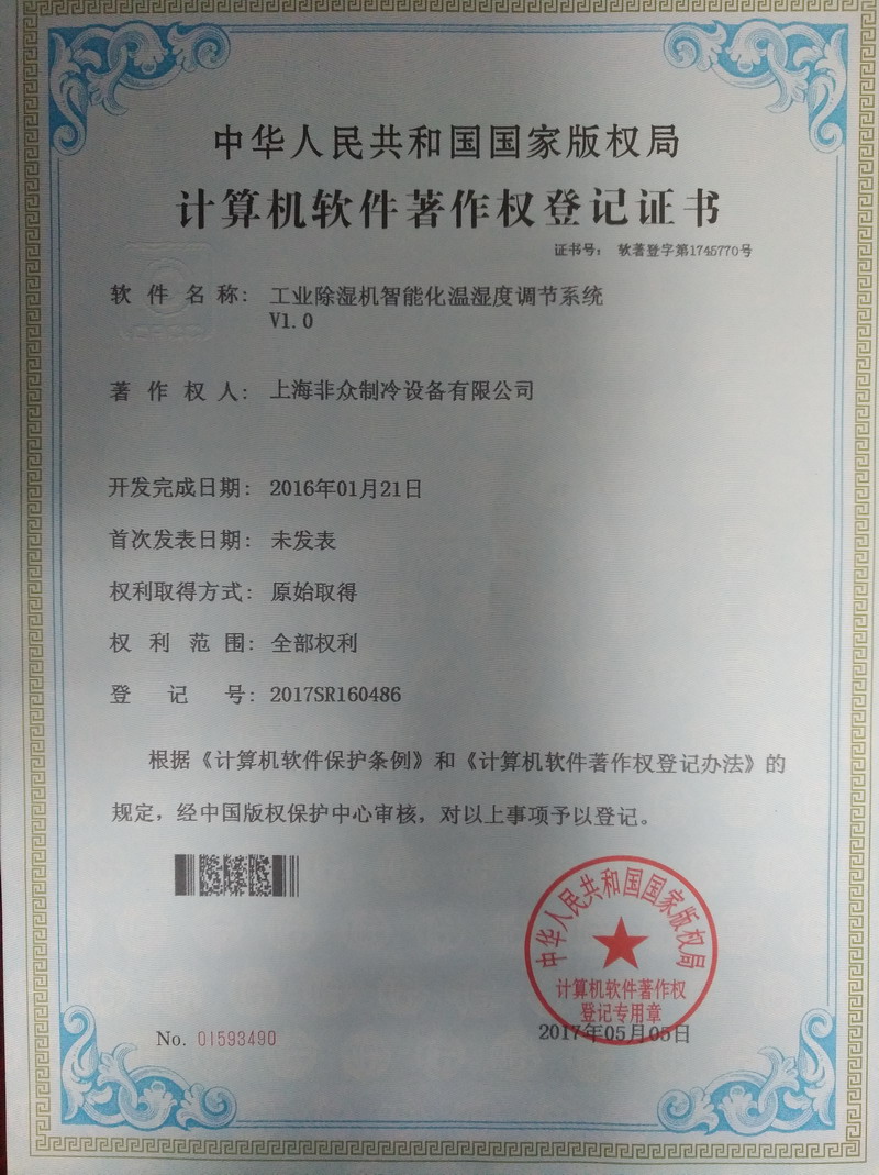 眾有實業(yè)資訊:上海眾有實業(yè)有限公司旗下子公司上海非眾制冷設(shè)備有限公司全新工業(yè)除濕機產(chǎn)品榮獲中華人民共和國國家版權(quán)局計算機軟件著作權(quán)登記證書!