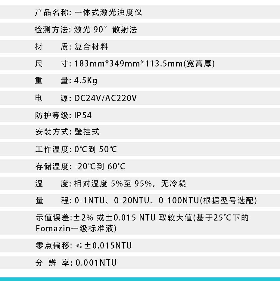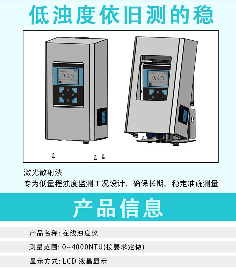 光電濁度儀是用于測(cè)量懸浮于水或透明液體中不溶性顆粒物質(zhì)所產(chǎn)生的散射程度,并能定量表征這些懸浮顆粒物質(zhì)的含量。本儀器采用國(guó)際標(biāo)準(zhǔn)ISO7027中規(guī)定的福爾馬肼濁度標(biāo)準(zhǔn)溶液進(jìn)行標(biāo)定。廣泛應(yīng)用于發(fā)電廠、自來(lái)水廠、生活污水處理工廠、飲料廠、環(huán)保部門、工業(yè)用水、制酒行業(yè)、制藥行業(yè)、防疫部門、醫(yī)院等部門的濁度測(cè)定。