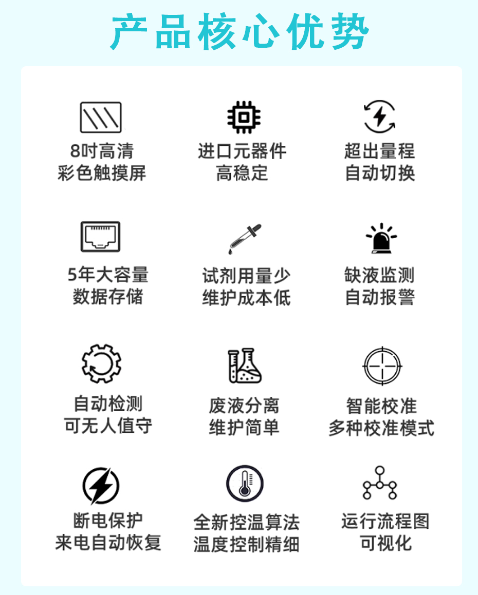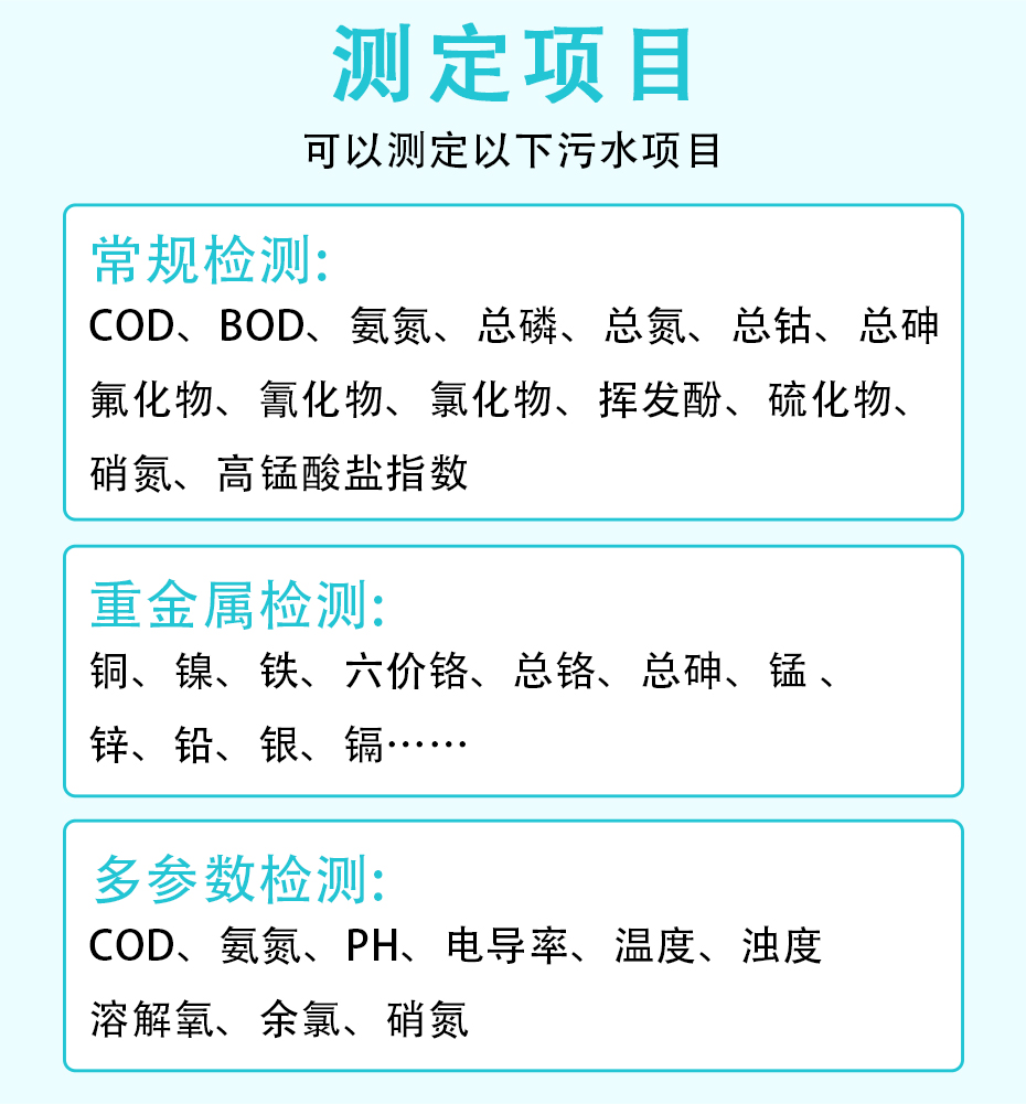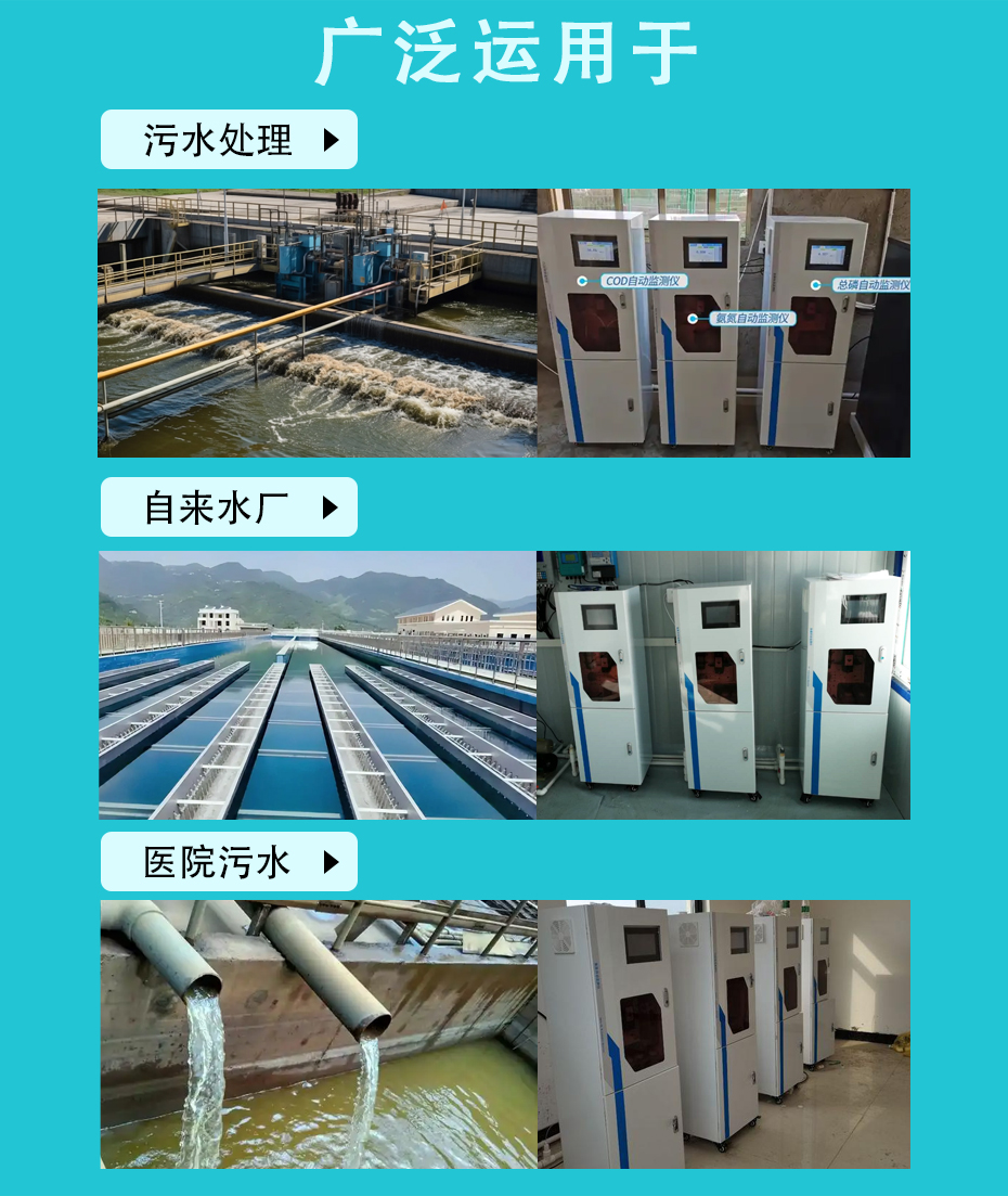 該分析儀能夠根據現場設定長期無人值守自動連續工作,廣泛適用于工業污染源排放廢水、工業過程工藝廢水、工業污水處理廠污水、市政污水處理廠污水等場合。根據現場測試工況的復雜程度,可選配相應的預處理系統,以保證測試過程可靠、測試結果準確,充分滿足不同場合現場需求。